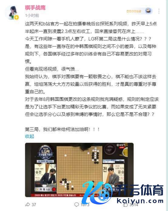 "柯洁两次莫得放进去被判负亦然首例,这个规章旧年 11 月刚出的,对咱们很不利,因为咱们王人备莫得这个见解。比如教养带队前细则会领导,之前三星杯时教养就有领导。这个事情自己是莫得任何意旨的,没思到敌手会去举报。但即使莫得举报韩国裁判也会主动介入。不像中国裁判,只有对局者不言语,裁判是不会先容。此依次二局是敌手主动建议来,我合计是棋手不说念德。"